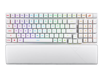 Produktbeskrivning ASUS ROG Strix Scope II RX - tangentbord - 96% full size - vit Inmatningsenhet Typ av enhet Tangentbord Bakgrundsbelyst Per-tangent RGB Gränssnitt 2.4 GHz, Bluetooth 5.1, USB Trådlös mottagare USB ROG Omni trådlös mottagare Anslutningsteknik Trådlös, kabelansluten Snabbtangentsfunktion Rullningsknapp för volym, multifunction, programmerbar, multimedia Numeriskt tangentbord Ja Gaming Ja Nyckellåstyp ROG RX RED optiskt mekaniskt Färg Vit Dimensioner (BxDxH) 37.7 cm x 13.1 cm x 4 cm Vikt 1.012 kg - Nedladdningsbara filer