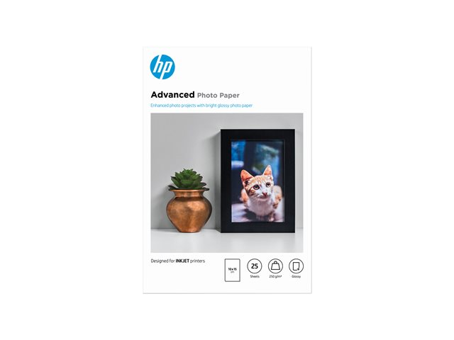 Produktbeskrivning HP Advanced Glossy Photo Paper - fotopapper - blank - 25 ark - 100 x 150 mm - 250 g/m² Typ av produkt Fotopapper Ytbeläggning Blank Mediastorlek 100 x 150 mm Medievikt 250 g/m² Medföljande antal 25 ark Kompatibel med Deskjet 21XX, 2622, 36XX; ENVY 45XX, 50XX, 76XX; ENVY Inspire 7255, 79XX; Ink Tank 319; Ink Tank Wireless 410; Officejet 38XX, 52XX, 6000, 6000 E609, 6500 E709, 68XX, 7000 E809, 75XX, 80XX; Officejet Pro 7720, 87XX; PageWide Pro 477; Photosmart B110, Wireless B110; Smart Tank Plus 55X, 571, 655 - Nedladdningsbara filer