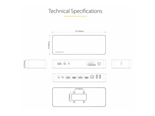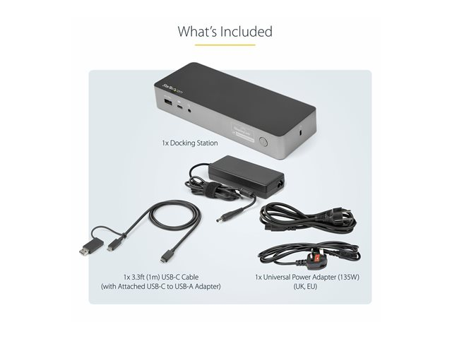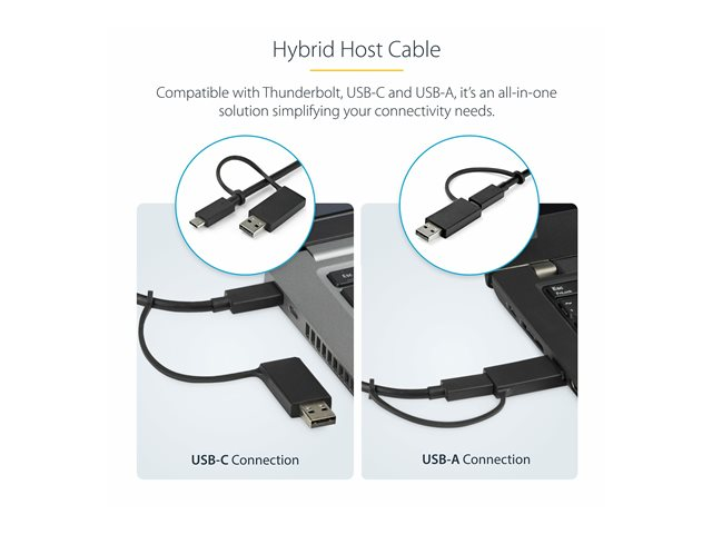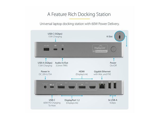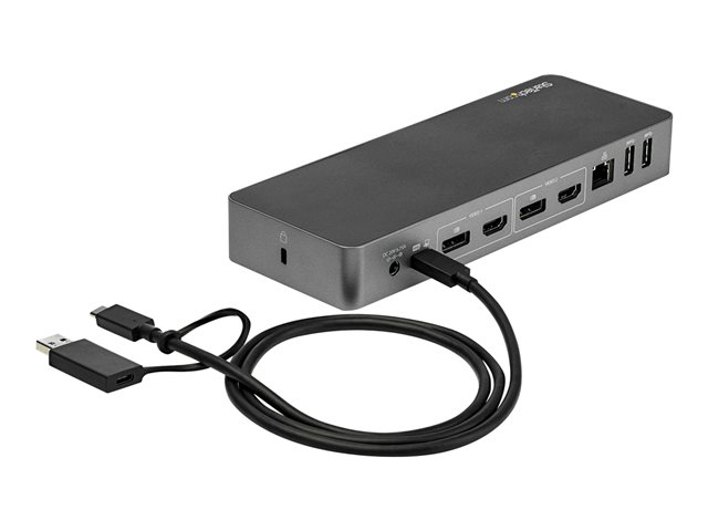 Produktbeskrivning StarTech.com USB-C- och USB-A-dockningsstation - hybrid universell dockningsstation för bärbar dator med dubbelskärm för 4K vid 60 Hz samt HDMI och DisplayPort - USB 3.1 Gen 1-hubb, GbE - strömförsörjning på 60 W - Windows, Mac och Chrome - dockningsstation - USB-C - 2 x HDMI, 2 x DP - 1GbE Typ av produkt Dockningsstation Dockningsgränssnitt USB-C Videogränssnitt 2 x HDMI, 2 x DP Dimensioner (BxDxH) 22 cm x 8 cm x 3 cm Vikt 280 g Färg Svart, rymdgrå Lokalisering Storbritannien, Europa Nätverk Gigabit Ethernet Strömtillförsel Strömadapter AC 120/230 V Tillverkarens garanti 3 års garanti - Tillbehör